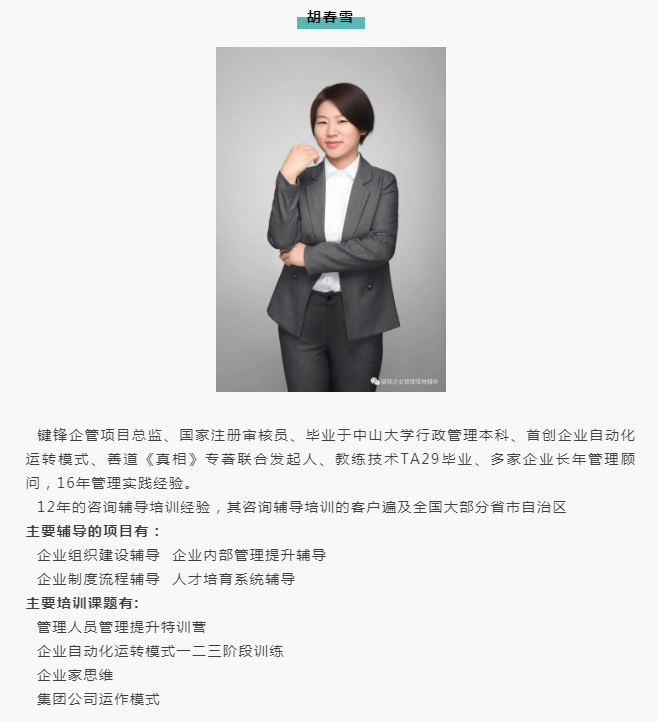 3、老師平均年齡都在40歲以上,在企業從事高管工作8年以上,咨詢輔導過的企業都在40家以上,咨詢輔導行業經驗豐富、功底扎實過硬,對學員的能力提升和企業難題具有實戰成功的解決方案