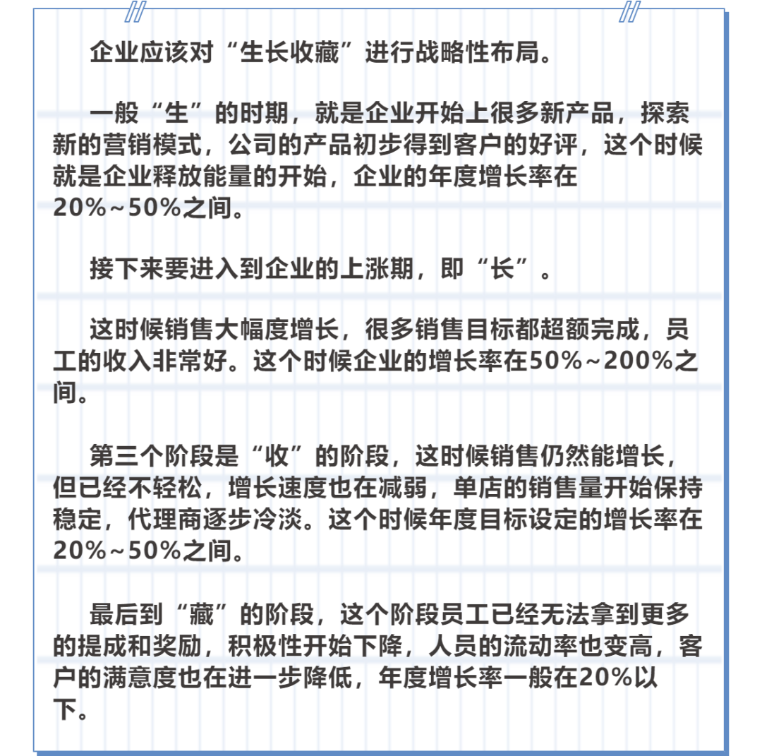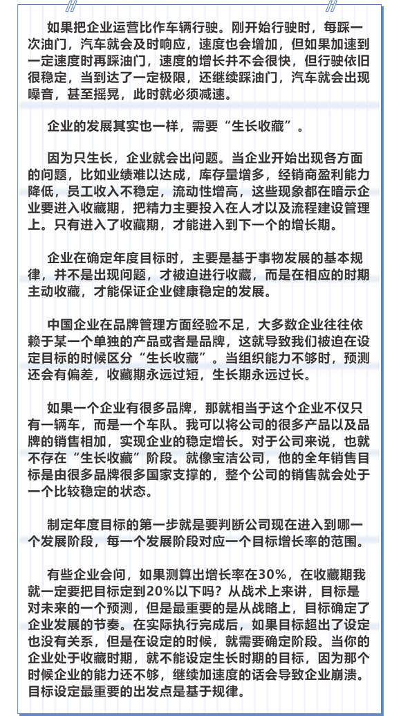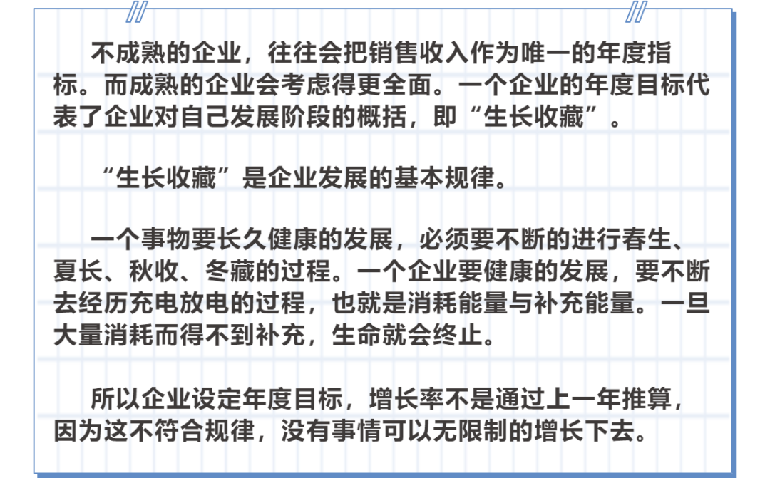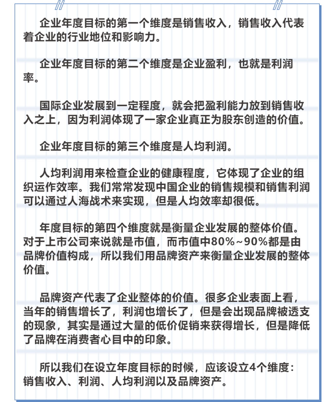 大多數企業會把銷售收入作為企業目標,首先確定一個增長率,根據去年的業績乘以增長率算出明年的目標。但是從企業發展的角度來看,企業的年度目標有4個不同的維度,這4個維度就是保證企業長期發展的核心要素。