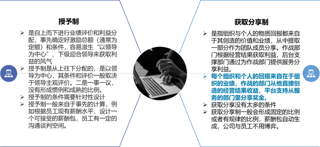 例如薪酬包的源頭,其實(shí)就可以追溯到預(yù)算,預(yù)算也分為戰(zhàn)略預(yù)算和經(jīng)營(yíng)預(yù)算,戰(zhàn)略預(yù)算就可以和授予制聯(lián)系起來(lái),從上往下確定戰(zhàn)略糧食包;而經(jīng)營(yíng)預(yù)算則對(duì)應(yīng)獲取分享制,從下往上明確經(jīng)營(yíng)糧食包。拉通后,人們會(huì)更加理解整個(gè)邏輯,看到更大的視野,從而使整個(gè)體系運(yùn)轉(zhuǎn)更順暢。